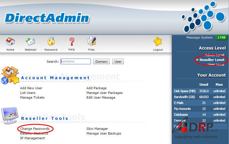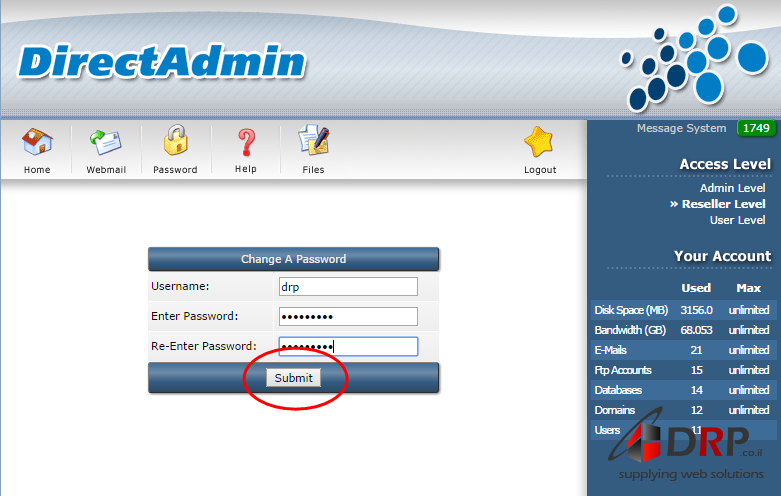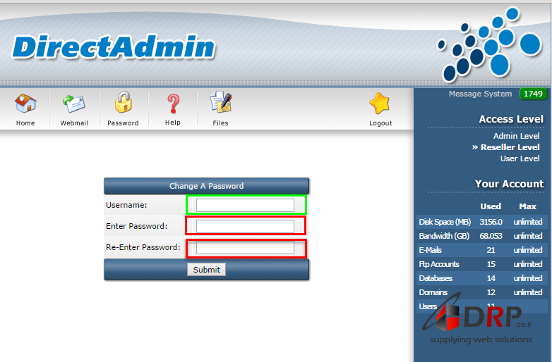 מדריך החלפת סיסמא למשתמש נכתב ב 12 באוקטובר 2014 /קטגוריה פאנל ניהול Directadmin במדריך זה נבין איך בתור Reseller לשנות סיסמא למשתמש. 1. בחלון הראשי נלחץ על Change Passwords. 2. נמלא את הפרטים בשדות: * שם משתמש. *סיסמא חדשה 3.בסיום נלחץ על Submit Comments comments