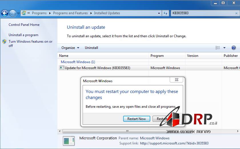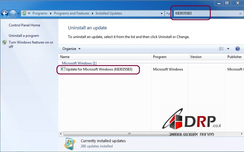 5. לאחר טעינת כל הנתונים, יש להקליד בשורת החיפוש את KB3035583. זה מספר העדכון שאחראי על ההתראה של שדרוג מערכת ההפעלה ווינדוס 10.