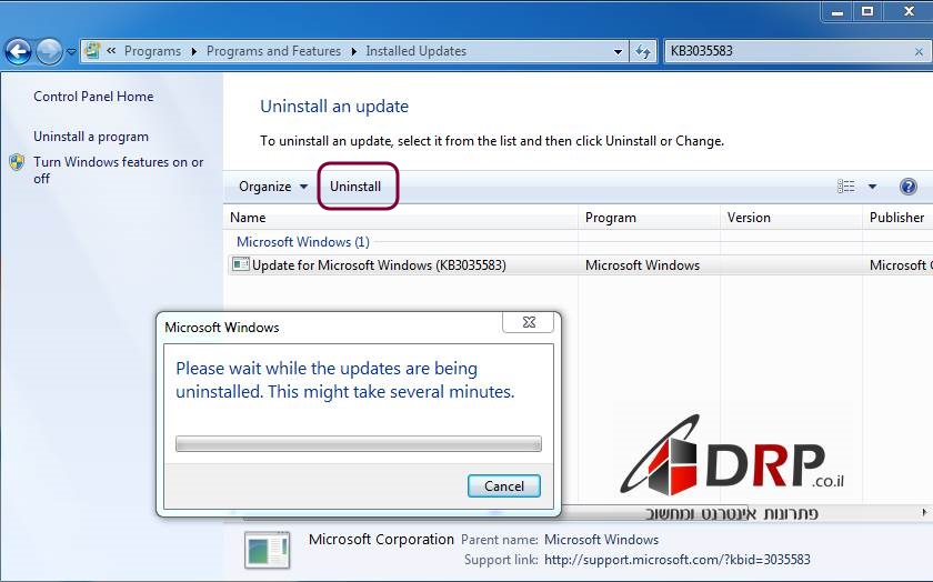 6. כעת, סמנו את העדכון הרלוונטי KB3035583 ולחצו על כפתור Uninstall והמתינו לסיום תהליך ההסרה.